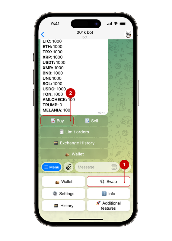 Step 1. Open the bot, select "Wallet" → "Swap" → "Buy"