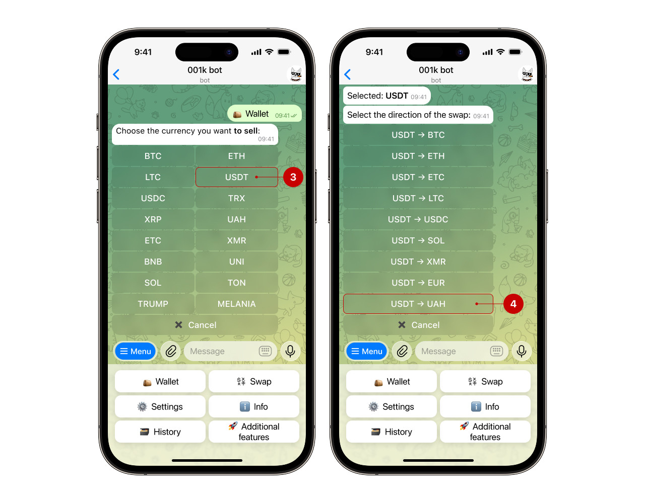 Step 1. Open the bot, select "Wallet" → "Swap" → "Sell
