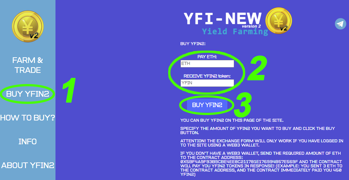 If you don’t have Web3 wallet(ex. Metamask), send ETH to our contract address: 0x5bf4a9f93b9cbe4ee8c211781e176994b57e569f — and then the contract will send YFIN2 tokens to your wallet!