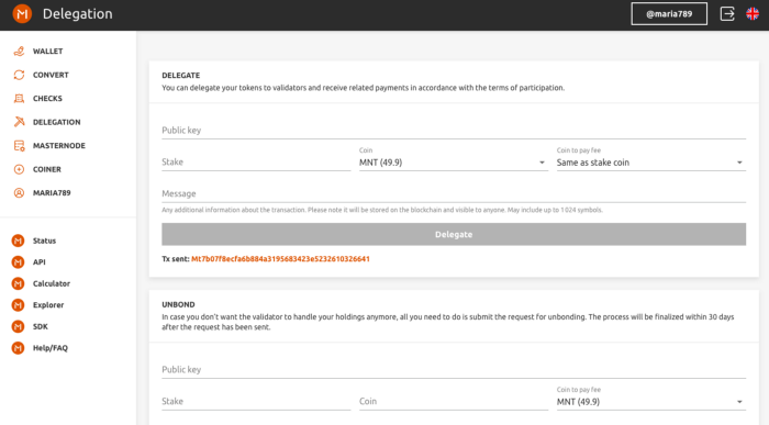 5. After you delegate coins to the masternode, you will see the message “Tx sent” under the “Delegate” button.