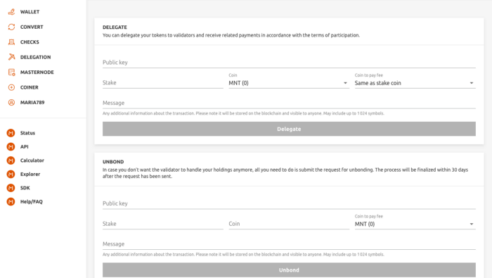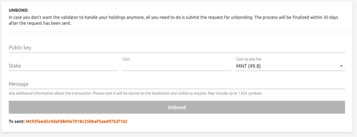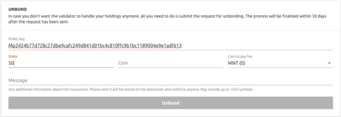 2. Enter the masternode’s public key, the volume of the stake you want to withdraw from it, and the desired coin for payment of the commission. Click “Unbond.”