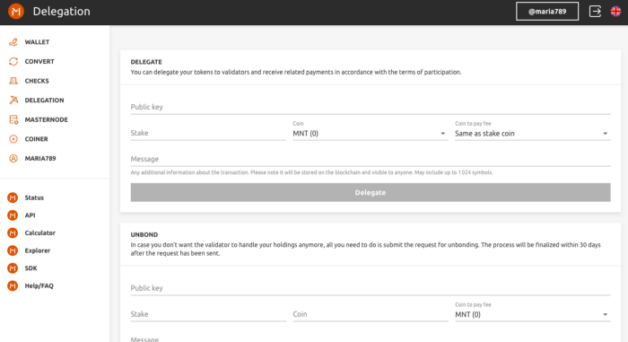 A holder of any coin in the Minter network can become a delegator. In order to become a delegator, the user must send a delegation transaction in which they indicate how many coins they want to bond to a particular validator. If the delegator decides to withdraw some or all of the coins, they can at any time make an appropriate request. The application will be processed within 30 days after filing.