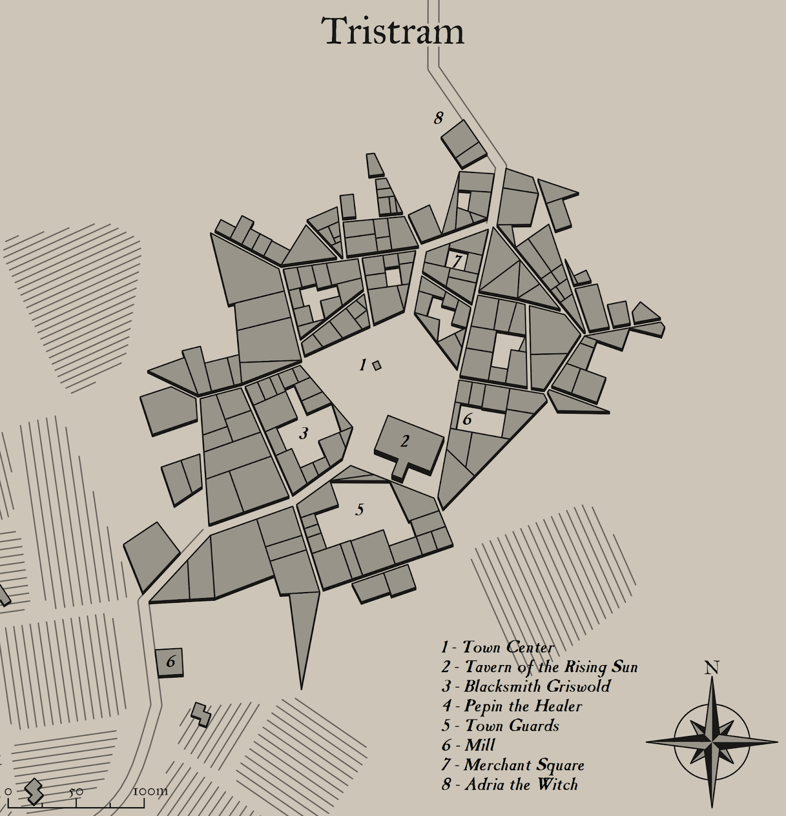 Якщо у вас вже є якісь глобальні ідеї щодо вашої кампанії, ви можете розмістити їх тут. Наприклад, я розмістив Трістрам (місто з правого боку) з монастирем біля підніжжя гори (на північ від Трістраму). Я також вирішив розмістити могилу Леоріка в іншому місці, щоб пустити в дію дику місцевість, тому замок в центрі на півночі є одночасно і його могилою, і замком, і підземеллям.