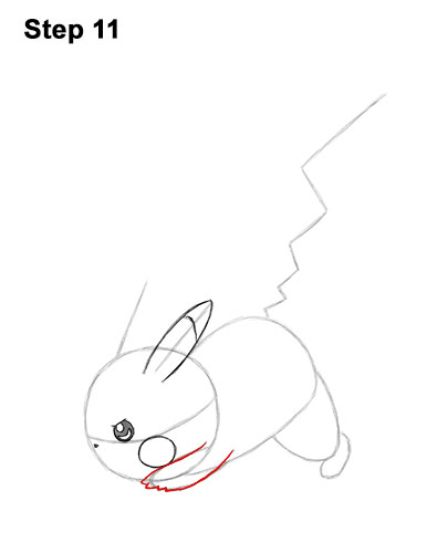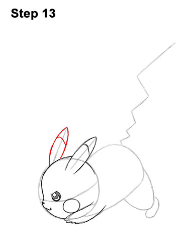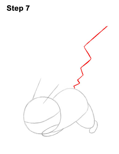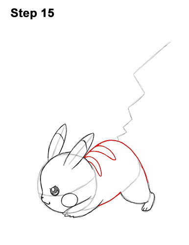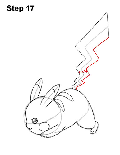 Step 16. Step 16: Add Pikachu's tail by first drawing a short vertical line to the left of the guide at the top. Now draw the shape of the tail by following the path of the guide. The line for the tail should get closer to the guide the farther down it goes.