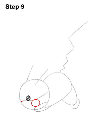 Step 9. Step 9: Under the construction line in the head, draw a small circle for Pikachu's red cheeks. The bottom of the cheek circle should touch the guide for the arm. On the left side of the head, under the construction line, draw a tiny triangle and shade it in for the Pokemon's nose.