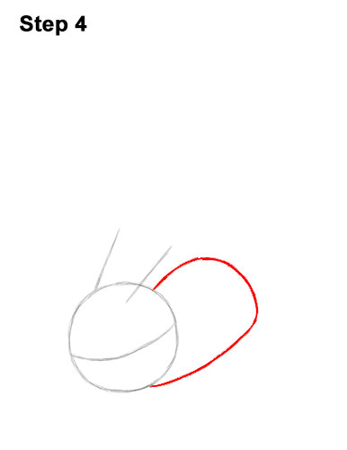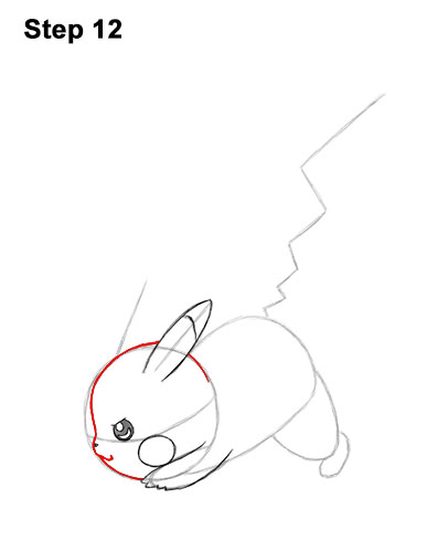 Step 12. Step 12: Use the initial circle as a guide to draw the shape of Pikachu's head. Darken the top edge of the initial circle but don't overlap the ear. As you darken the front of the face, make the line dip in more toward the eye. Curve the line under the nose and then upward so that it creates a smile. Now darken the rest of the initial circle at the bottom to complete the Pokemon's head.