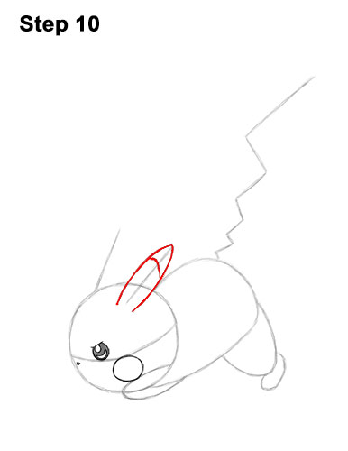 Step 10. Step 10: Use the line on top of the head, on the right, as a guide to draw Pikachu's first ear. Draw the curved shape of the ear around the guide. Add a curved line across the ear, near the top.