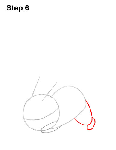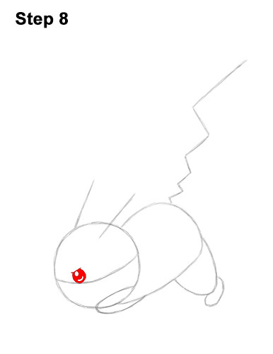 Step 6. Step 6: On the lower, right side of the body, draw a U-shaped arc as a guide for the top part of the leg. Below that, draw a small oval- like shape as a guide for Pikachu's foot.