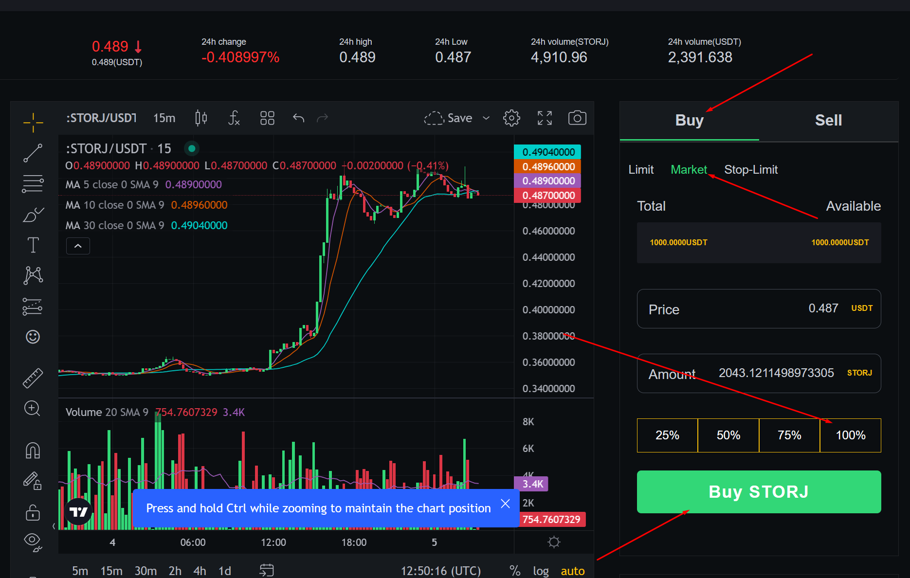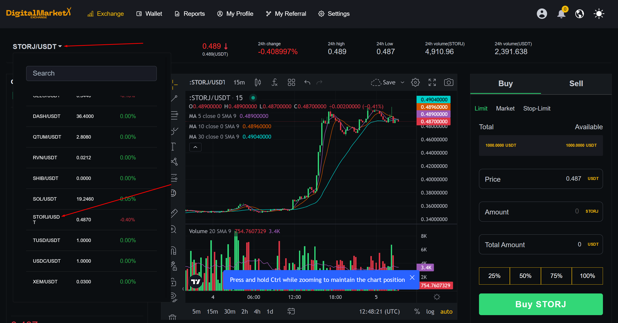Choose STORJ/USDT