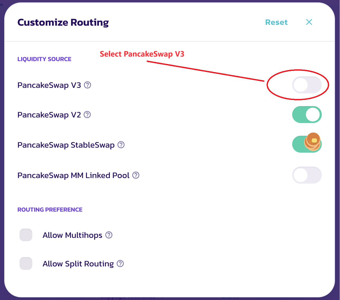 And in the advanced settings, we check that everything is configured as in the screenshot (Select PancakeSwap V3!!!):