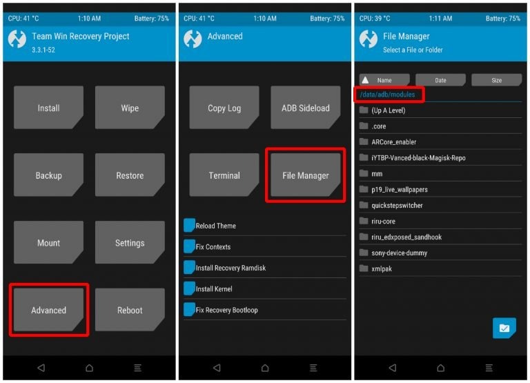 Once in TWRP, select Advanced > File Manager.