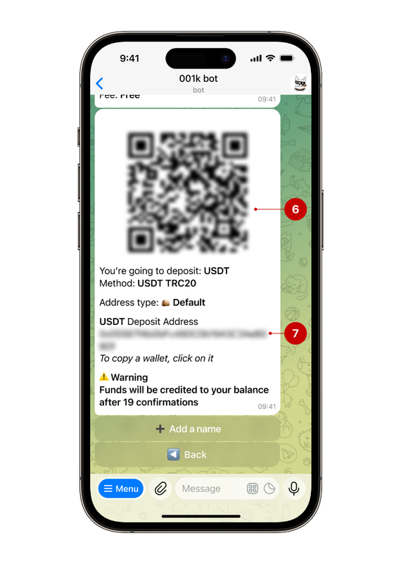 The bot will send a special QR code (6) that you can scan with another device and proceed to top up.