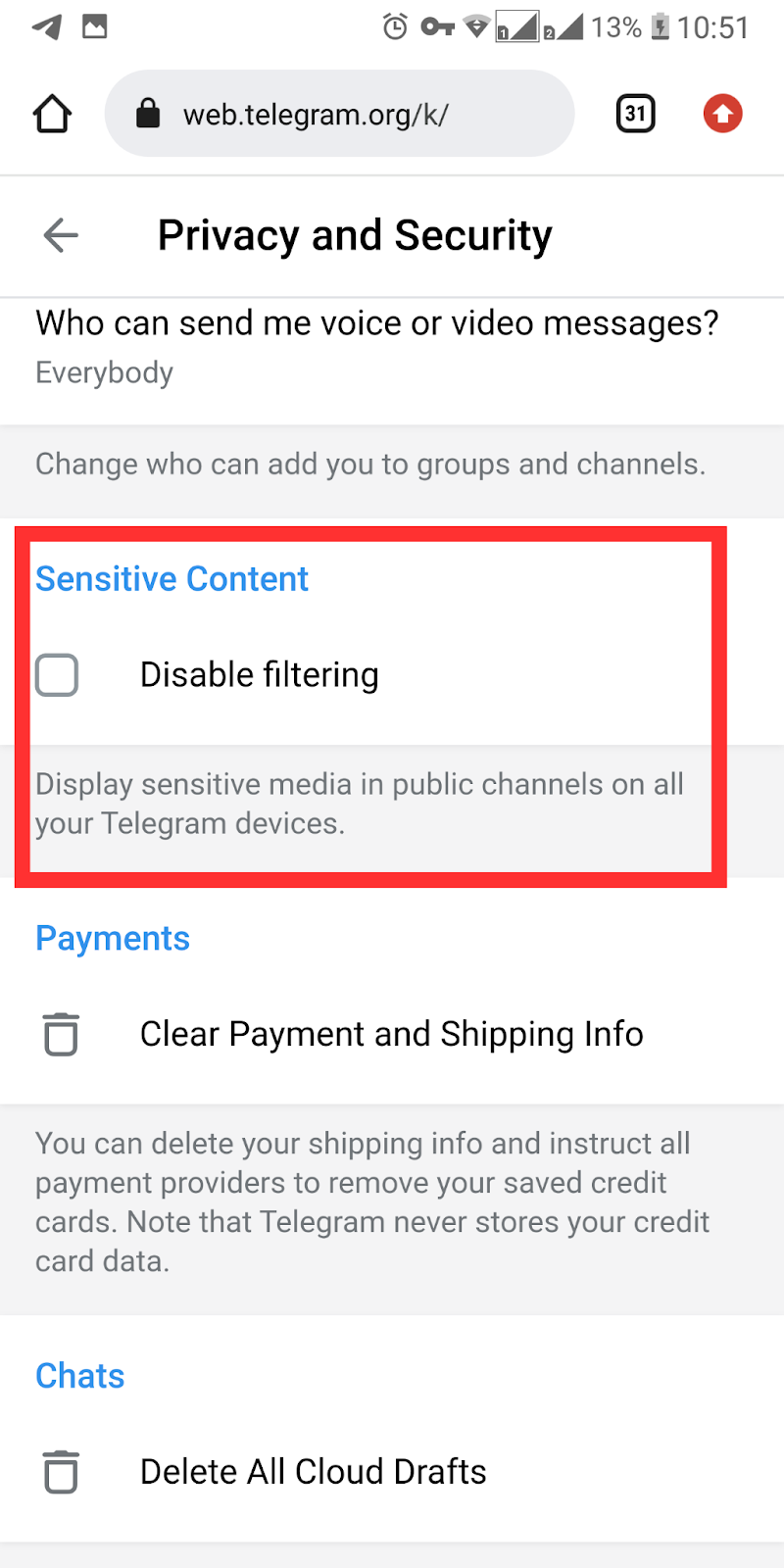 How to disable the Telegram filter for sensitive content