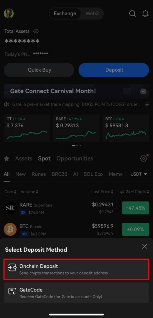 2. In the pop-up window, click on "Onchain Deposit".