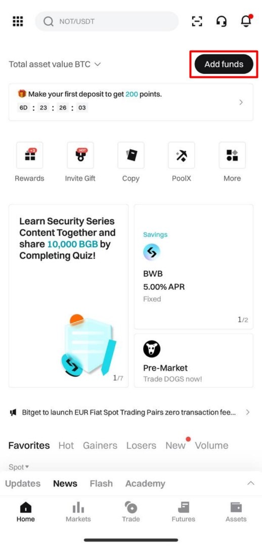 1. Tap on the "Add funds" button on the main page.
