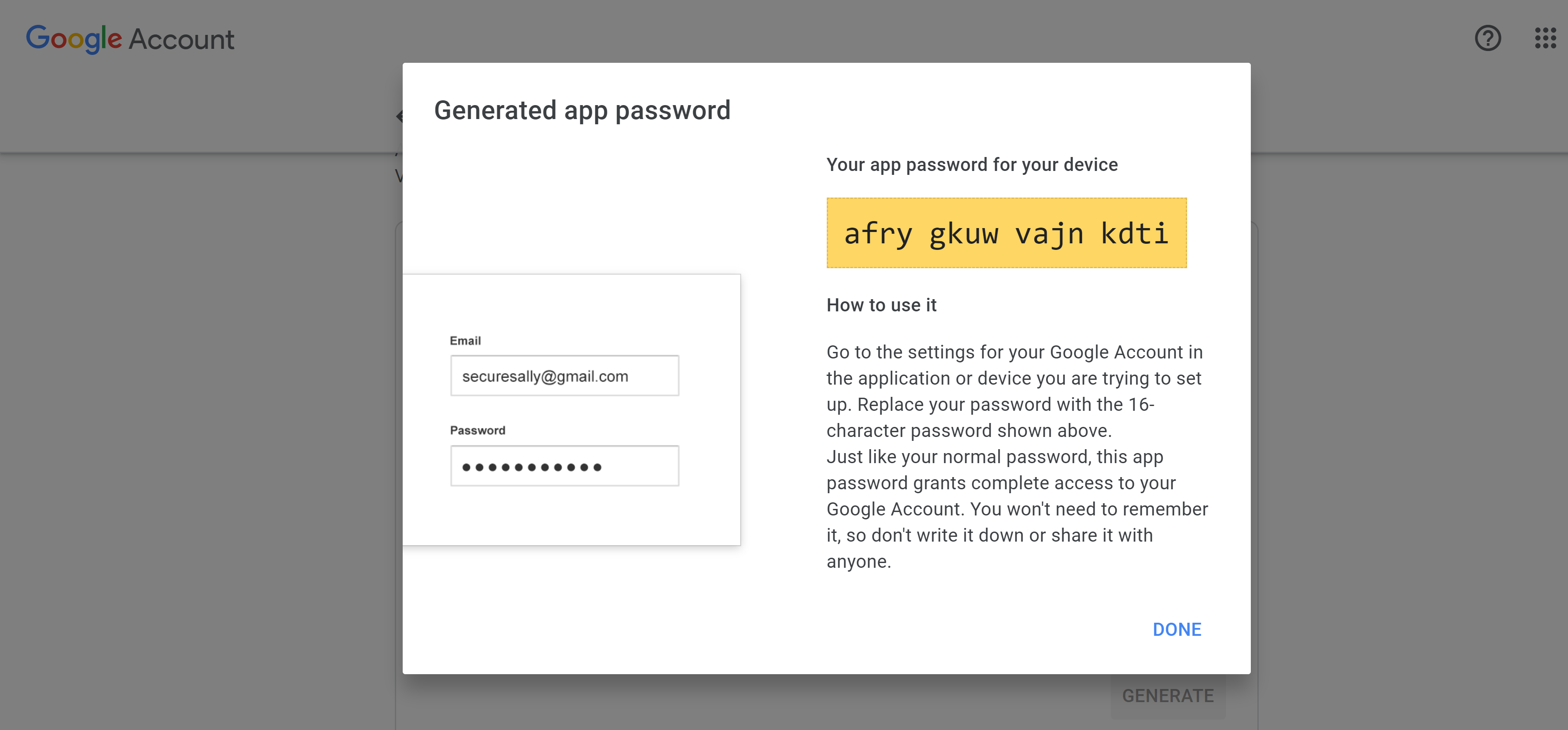 Copy the generated app password, because that will be the password for the password parameter.