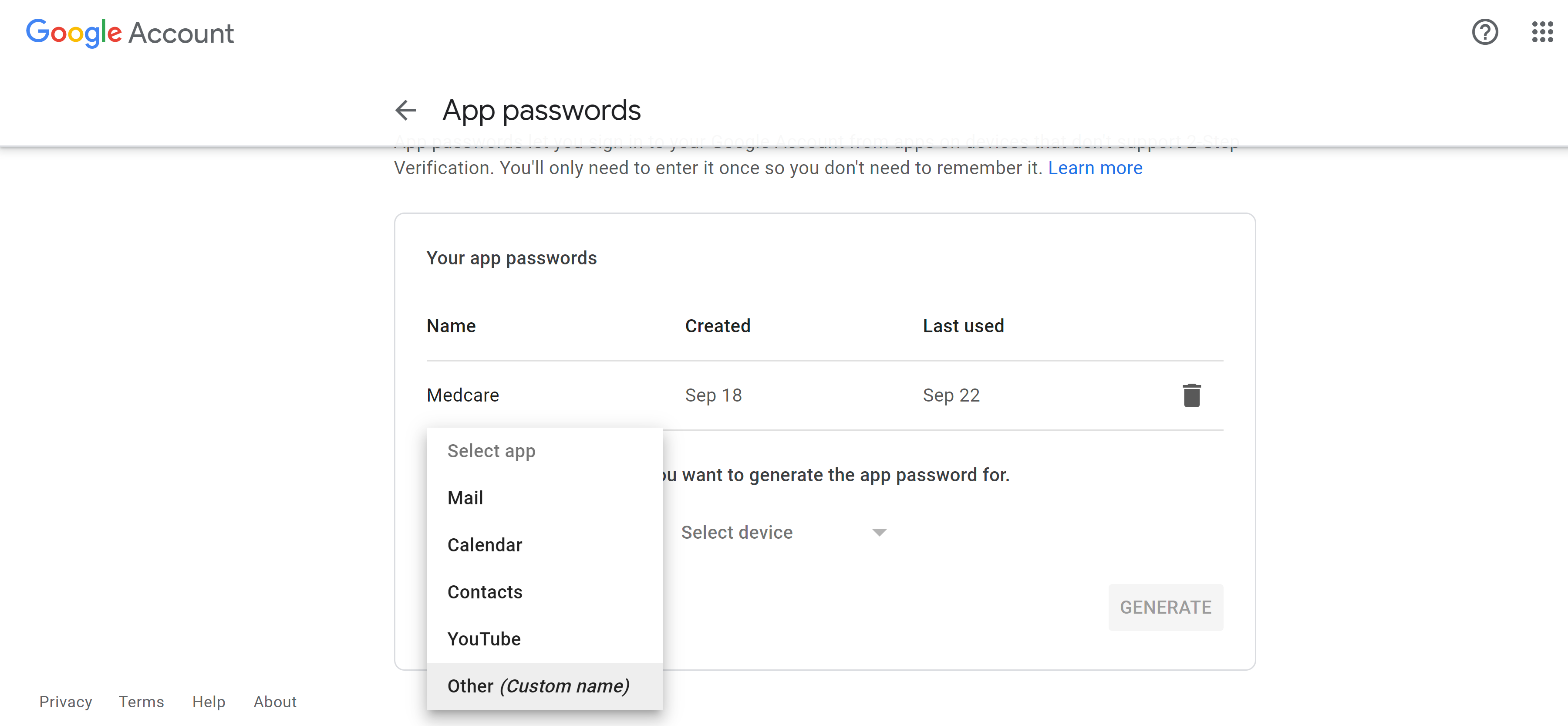 You will see a question asking if you want to generate an app password. Click on “Others” to generate an App password and click “Generate”: