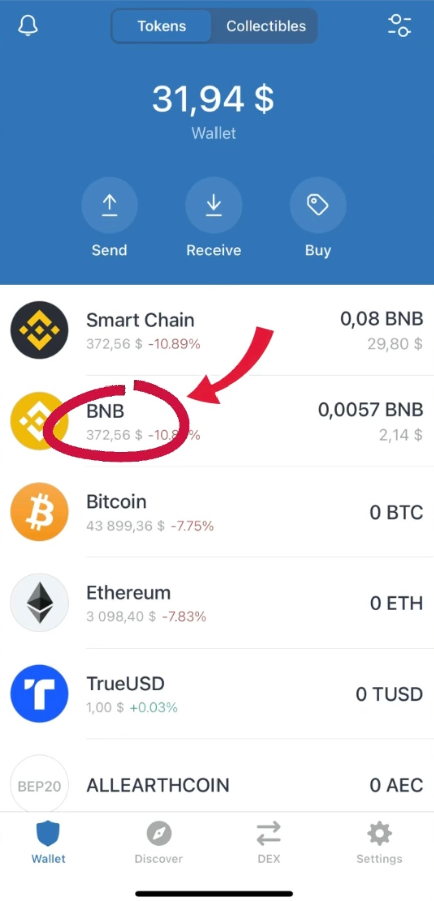 When you get to the start page of your ‘Trust’ wallet, press to go to the “BNB” coin