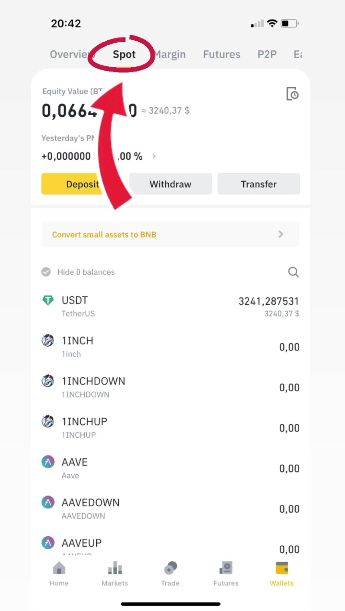 When you are on the 'Wallet' page in the 'Overview' section you need to go to the 'Spot' section at the top of your screen