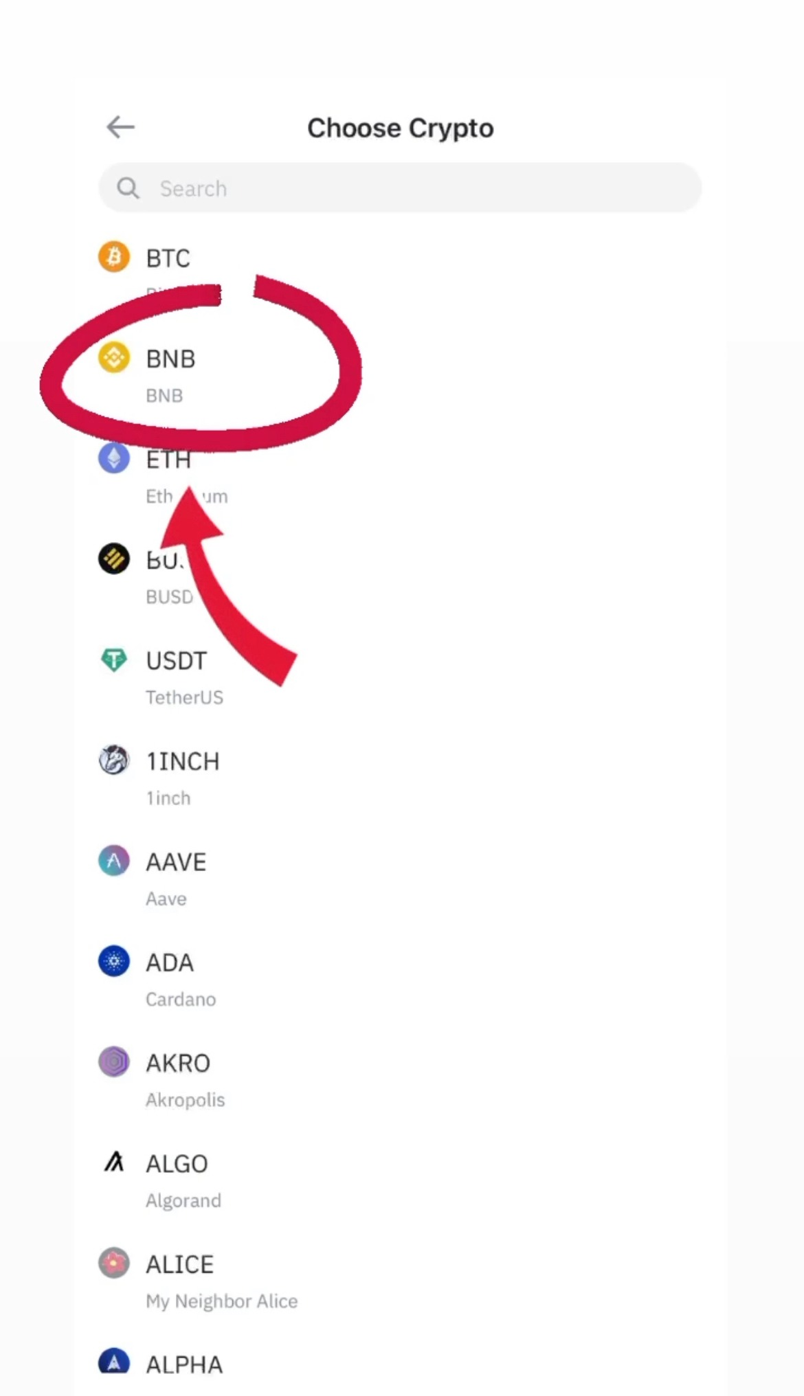 Select and click 'BNB' coin