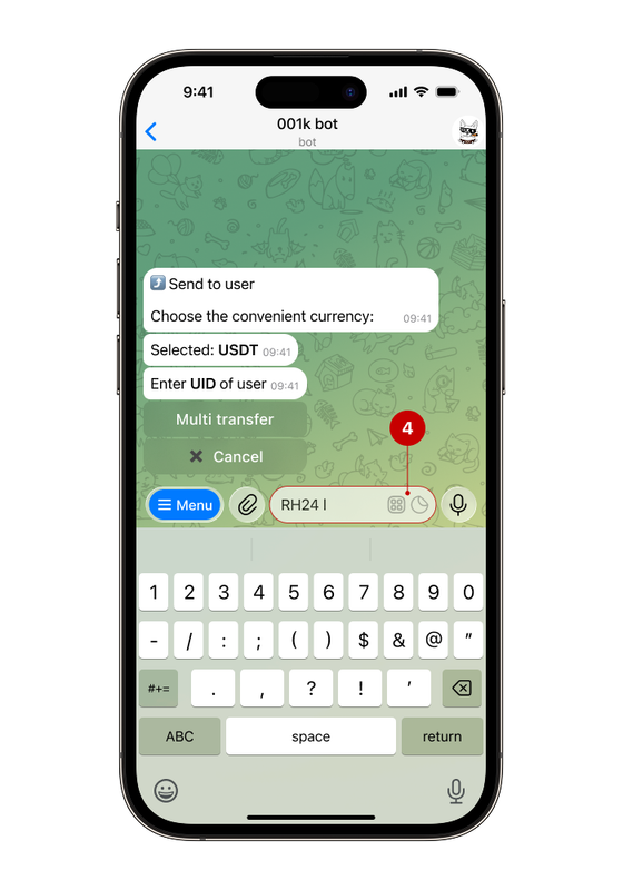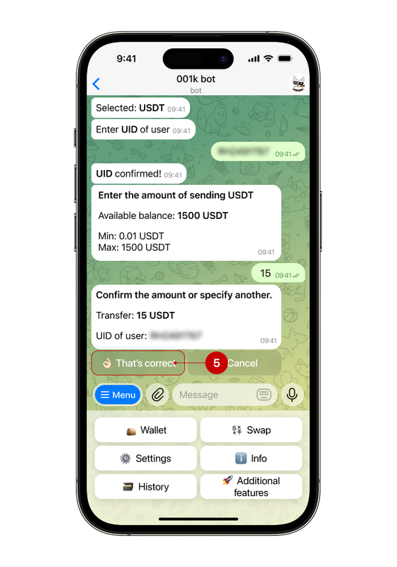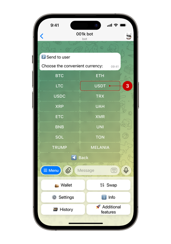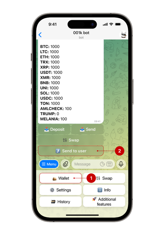 Step 1. Open the bot, select "Wallet" → "Send to user"