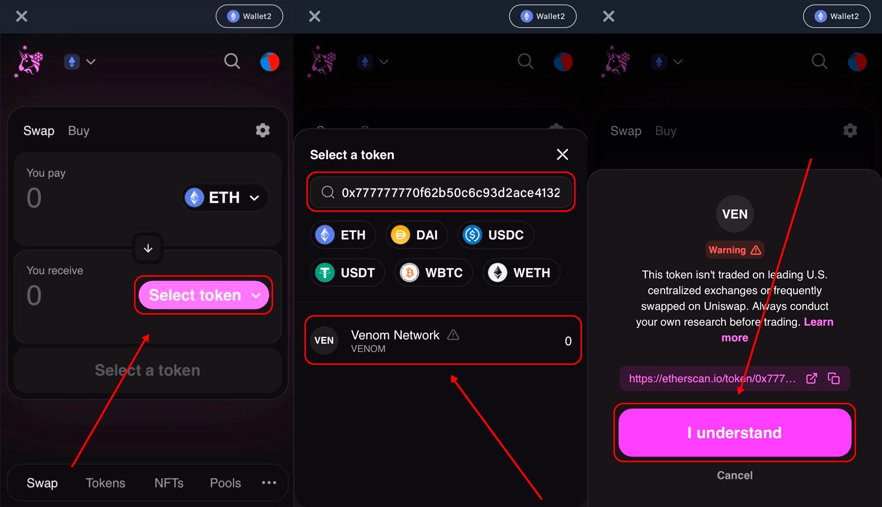 - Select the input (top) token and make sure the output (bottom) token is VENOM. If you can not find it by name, try searching by the contract address: