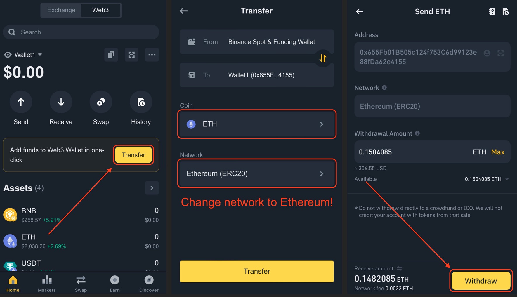 - Select ETH on Ethereum (ERC20) Network. You can actually transfer any other coin, but ETH is required to pay the network fee.