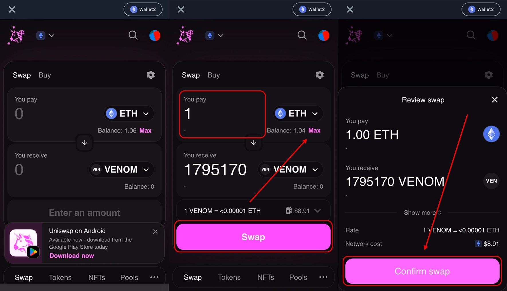 - Make sure the input (top) token is VENOM and select the output (bottom) token.