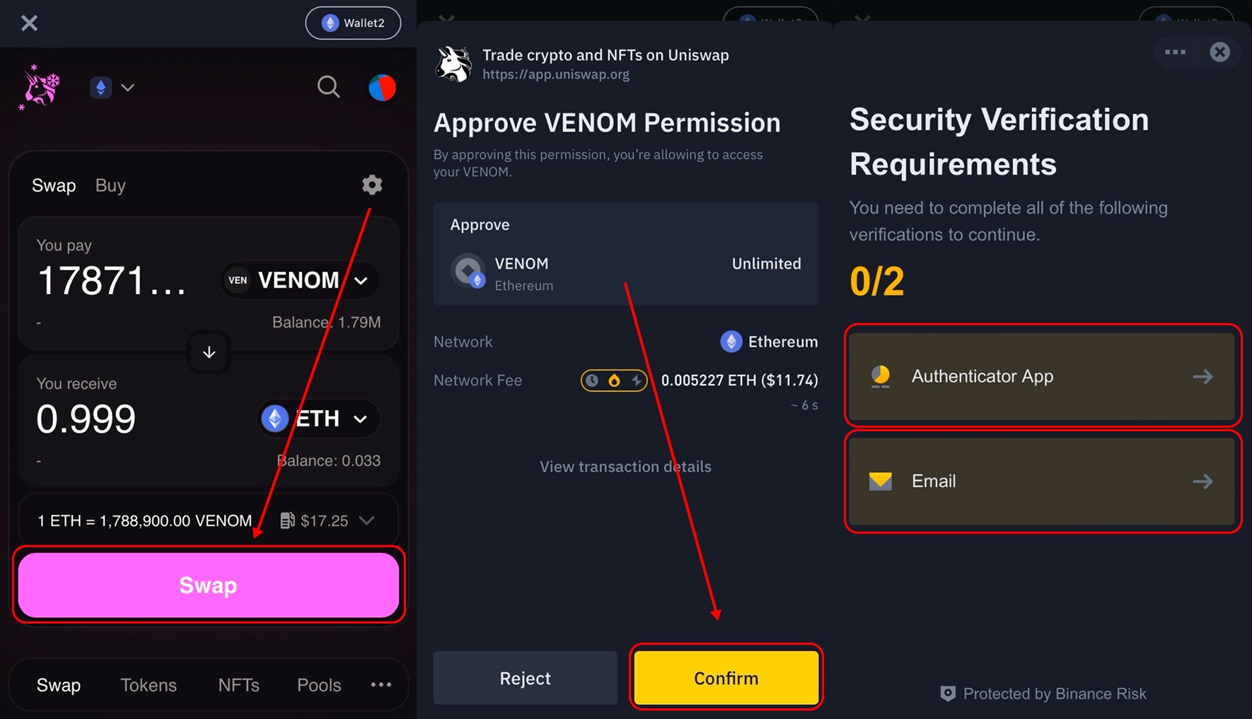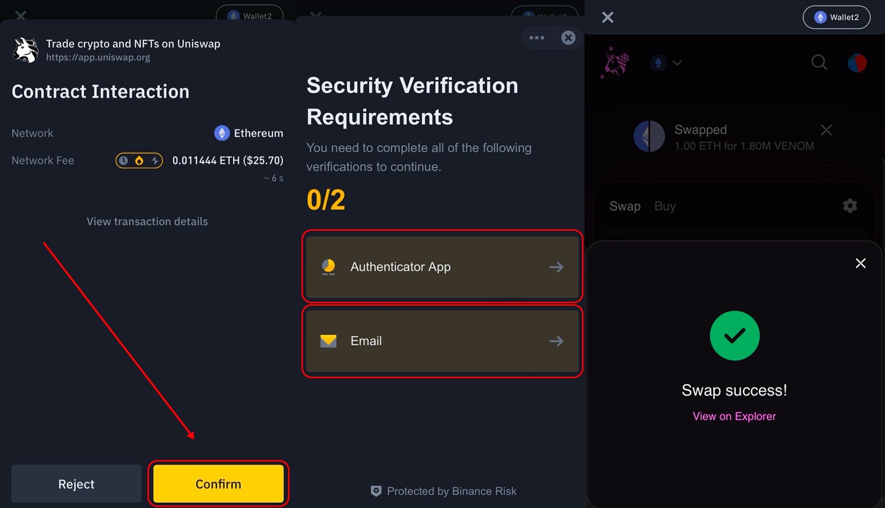 - Confirm the swap transaction(s) in your wallet and complete the security verification(s) if required.