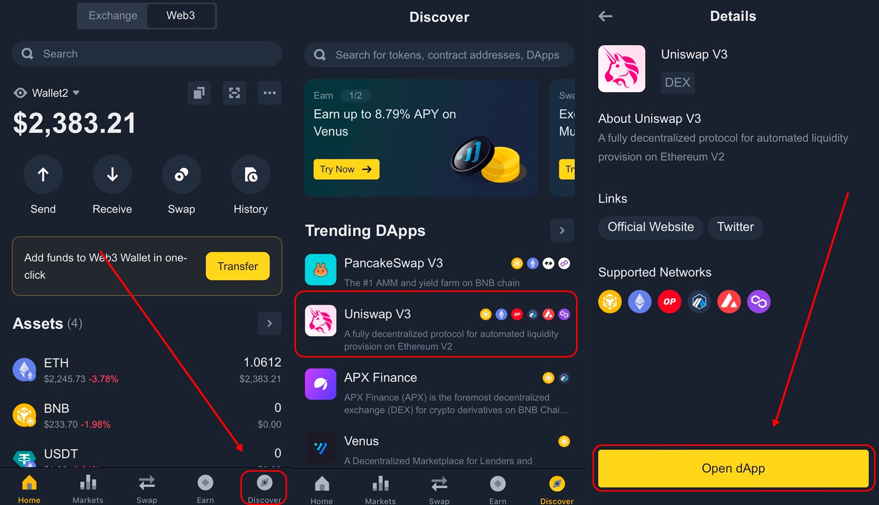 - In the list of trending DApps, find Uniswap V3 and click "Open dApp".