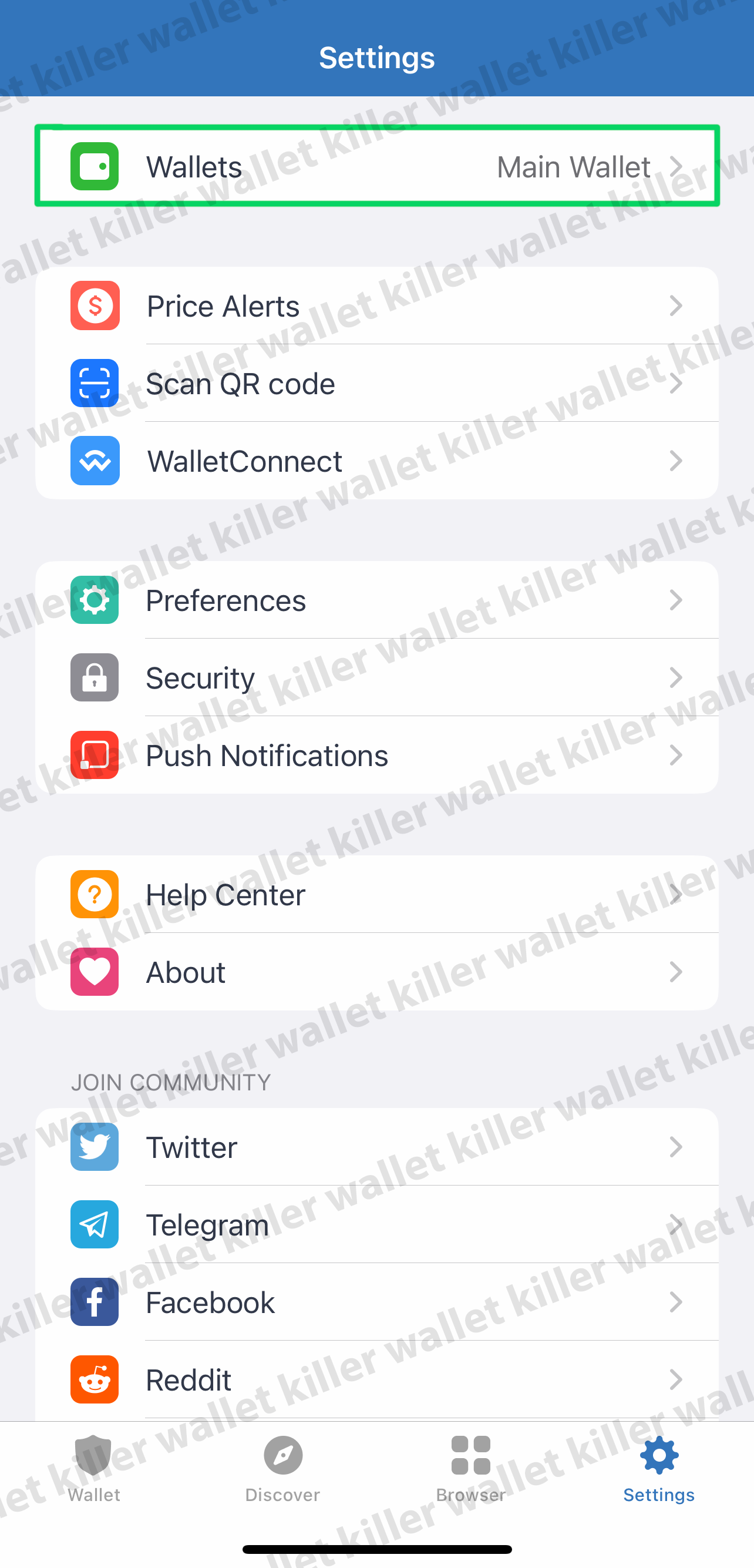 3. Next, you go to TrustWallet (you can use any other one). Press "Settings" - "Wallets"