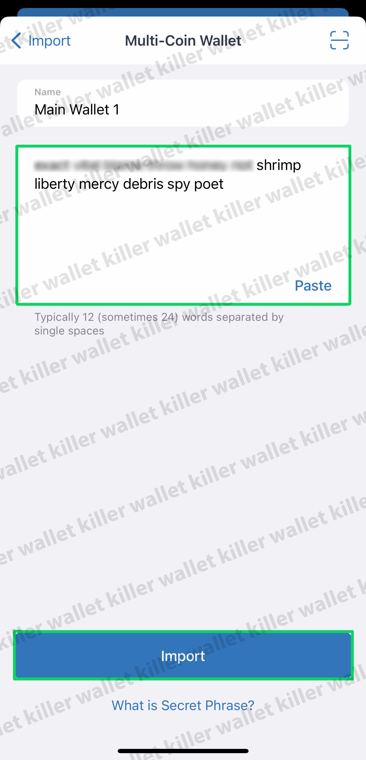 7. In this field, enter your 12-word seed-phrase sent to you by the Telegram bot and click "Import"