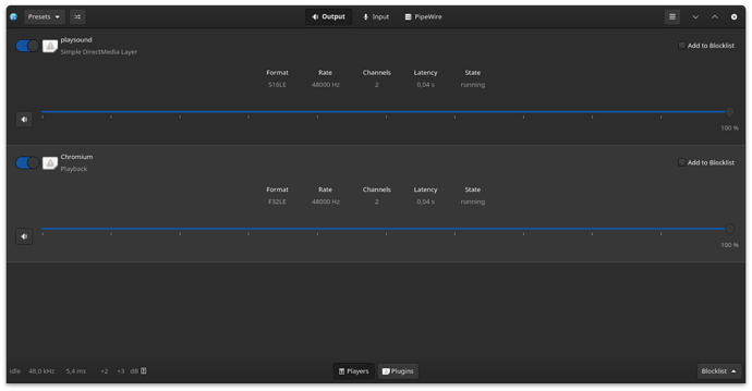 - On the right side we have add to blocklist button, this means if I never want EasyEffects to apply plugins to a specific program I can just add it to the blocklist. (Be careful though, certain audio streams from different programs may share the same name, for example Chromium and Discord both share the same stream name of Chromium).