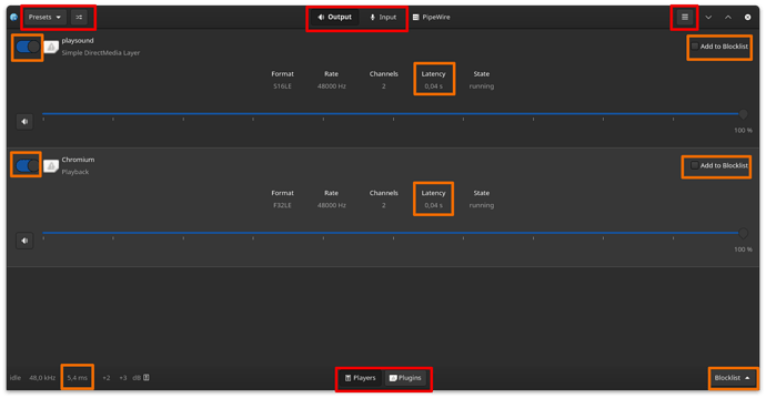 - In the middle we have the base latency of each audio stream displayed (0,04s = 40ms)