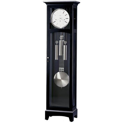 Horloge de sol Howard Miller Urban Floor Clock III (Erban Floor Clock III). Des lignes strictes et droites mettent en valeur le boîtier de cette montre et son fronton plat, terminé par des bordures nickelées. Des finitions en nickel sont utilisées sur la poignée de porte, les poids, le pendule et les moulures de base. Du verre biseauté est utilisé dans les portes supérieures et inférieures. Le corps est fabriqué à partir d’essences de bois durs sélectionnées. Les pieds de montre réglables assurent la stabilité sur les sols inégaux ou recouverts de moquette Mécanisme : Mécanique avec poids de suspension par câble (Kieninger, Allemagne) Boîtier : Satin noir Corne : Westminster, Taille de la gâche : 199 x 56 x 36 cm