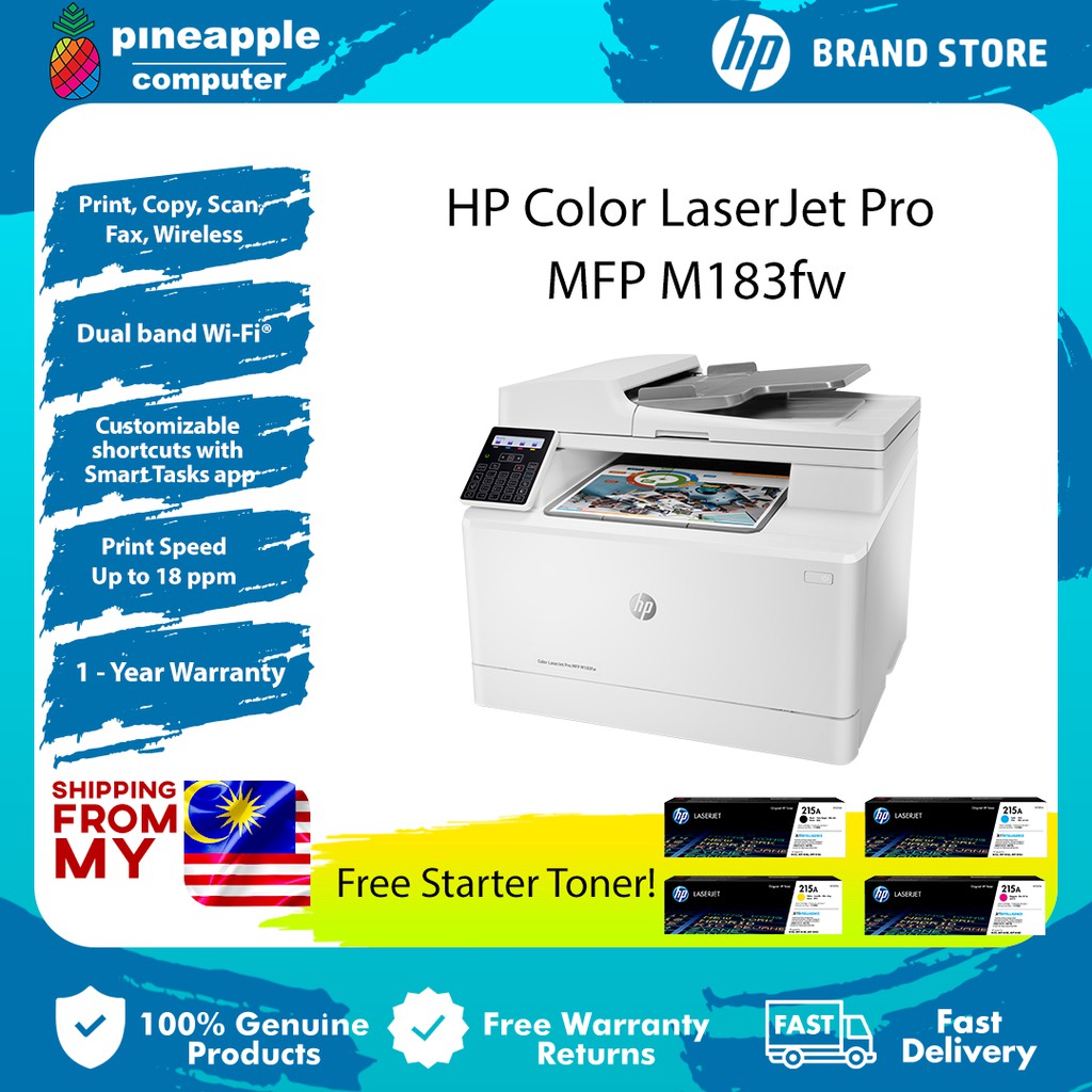 HP Color LaserJet Pro MFP M183fw | HP Store Malaysia . Color . Print, copy, scan, fax . Hi-Speed USB 2 .0 port; built-in Fast Ethernet 10/100 Base-TX network port, 802 .11n 2 .4/5GHz wireless, Fax port . One-year unit exchange warranty . Warranty and support options vary by product, country and local legal requirements .