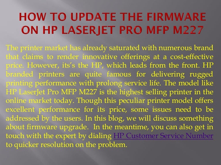 Be sure to use the firmware update utility that is specific to your printer model . This update is recommended for the HP LaserJet Pro MFP M227 series and Ultra MFP M230 series that have a firmware version older than the one posted This utility updates the printer firmware version to the latest version .