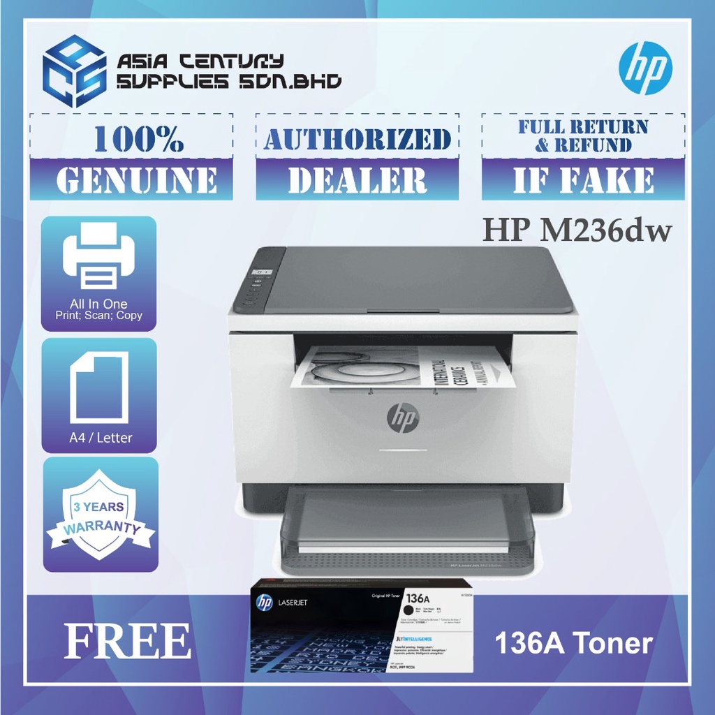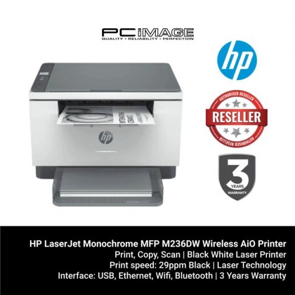 HP LaserJet MFP M236dw Printer | HP Store Singapore . Black and white . Print, copy, scan . 1 Hi-Speed USB 2 .0; 1 Fast Ethernet 10/100Base-TX; 1 Dual-band (2 .4/5 .0GHz) Wireless 802 .11b/g/n with Bluetooth® Low Energy . 3 Year Limited Warranty (Next Day On-Site) Laser . MRP $269 .00 .