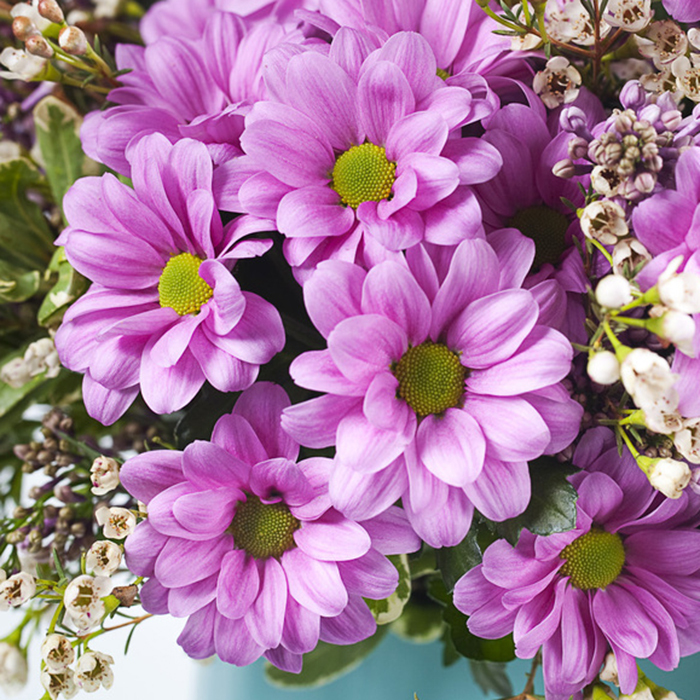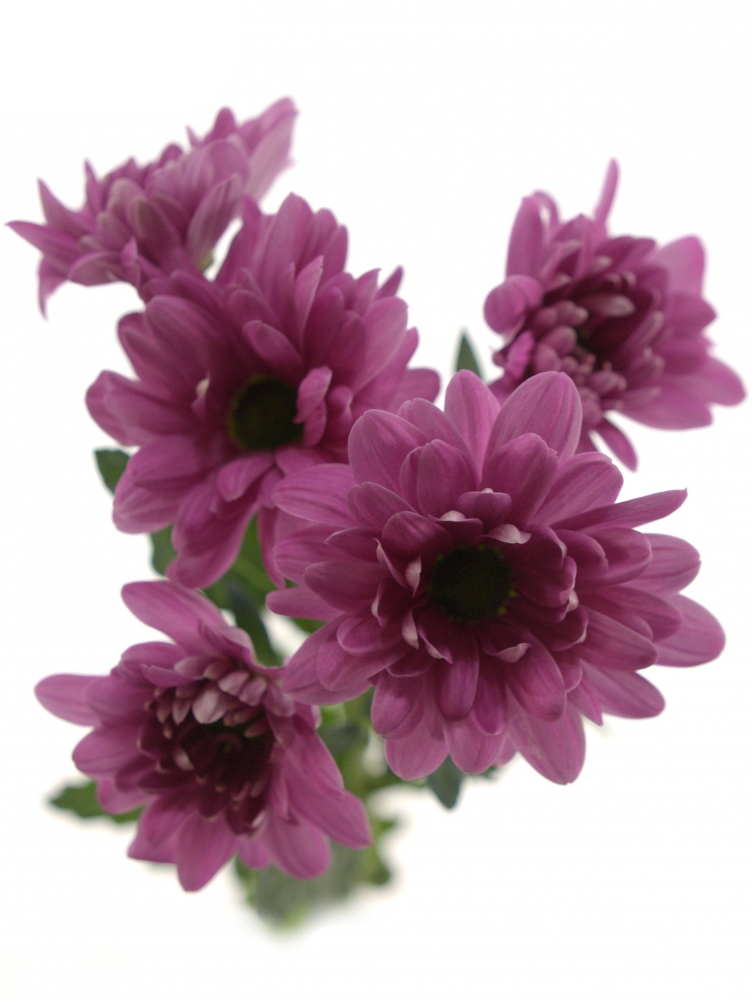 Талита (Talitha) фиолетовая хризантема с малиновым отливом в полном расцвете . Просекко (Prosecco) светлая с нежным кремовым оттенком, смахивает на ромашку .