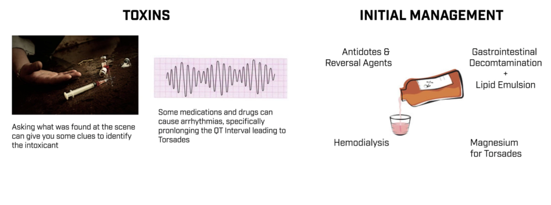 Отравления. Остановку сердечной деятельности может вызвать передозировка различными веществами,запрещенными и не очень . Тут будет крайне полезна информация о том,что было найдено рядом с больным при его обнаружении. О медикаментозной интоксикации могут говорить удлиненные интервалы QT и тахикардия "пируэт" на ЭКГ (характерно для передозировки некоторыми психотропными, антигистаминными, антиаритмическими и другими препаратами).