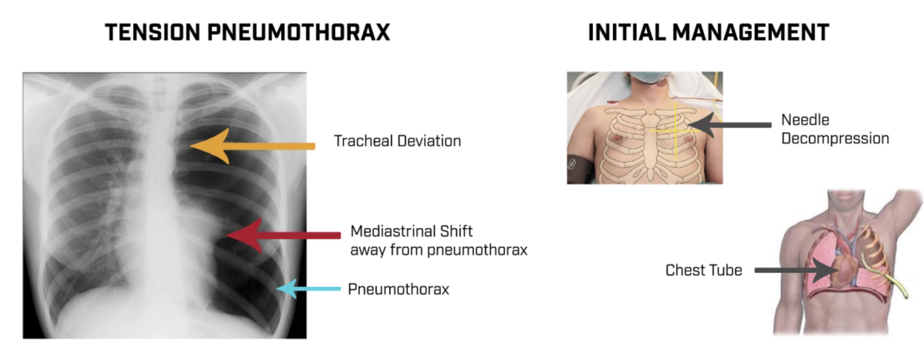 Лечение- декомпрессия иглой во втором межреберье по среднеключичной линии, дренирование плевральной полости.