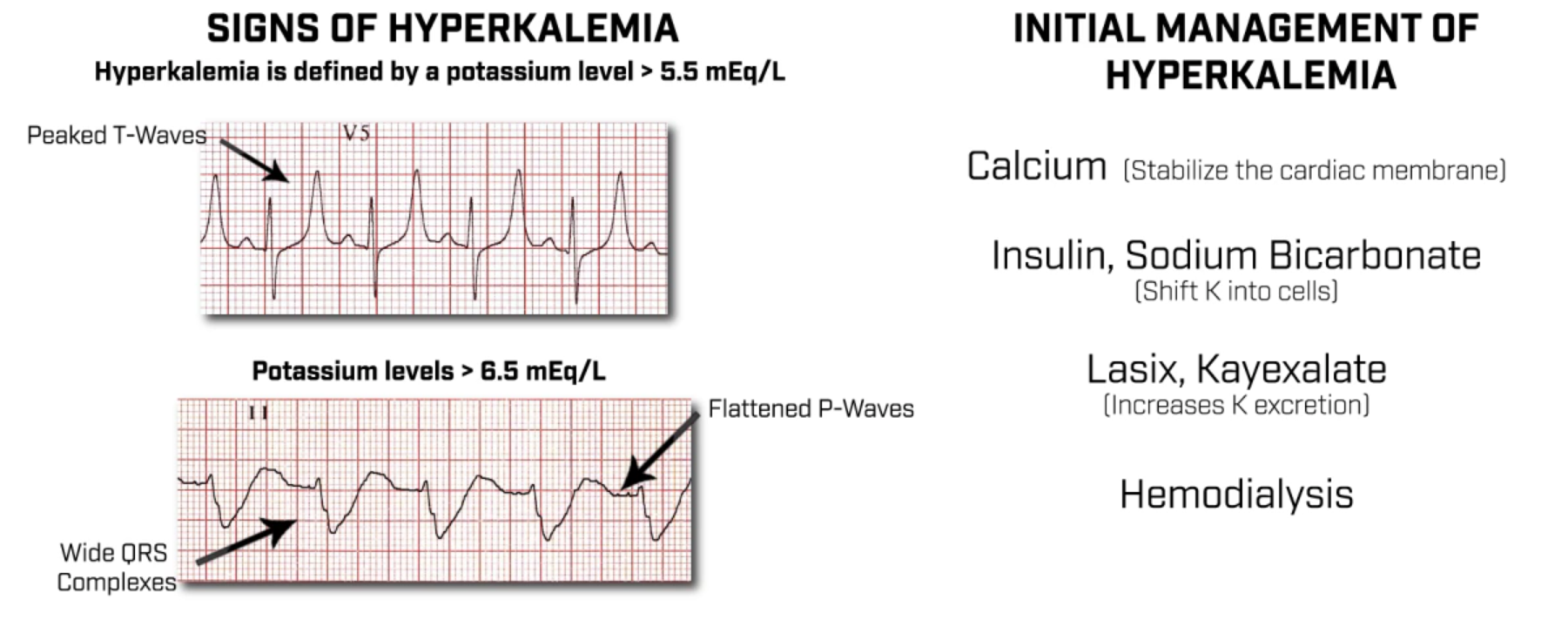 При гиперкалиемии препаратом первого выбора является кальций,обладающий мембраностабилизирующим действием. Можно ввести глюкозо-инсулиновую смесь или бикарбонат натрия,чтобы загнать калий внутрь клеток. Введение фуросемида увеличит экскрецию калия, но эффекта придется ждать подольше. В конечном итоге,таким пациентам может потребоваться гемодиализ.