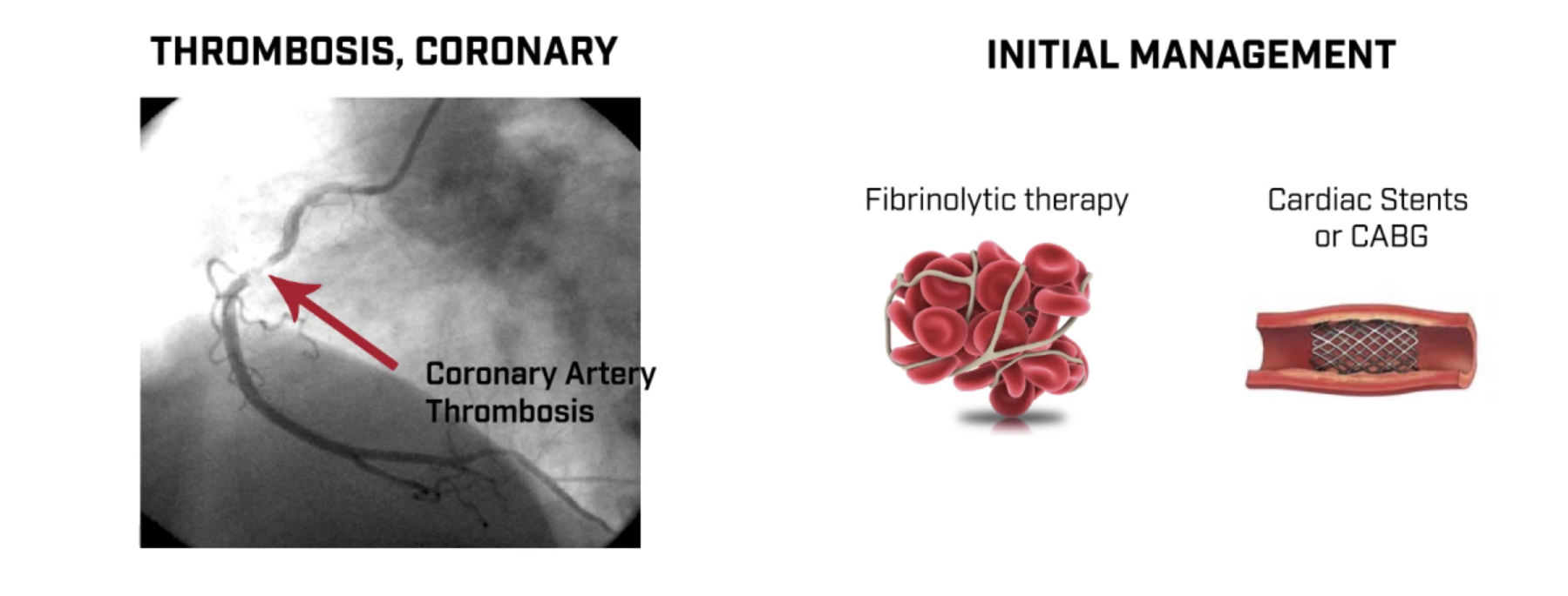 Окклюзия (тромбоз) коронарной артерии приводит к нарушению питания сердечной мышцы и, как следствие, к ишемии и инфаркту миокарда. Клинически можно заподозрить, если известно о жалобах пациента на загрудинную боль перед потерей сознания. На ЭКГ до остановки кровообращения может наблюдаться элевация сегмента ST.