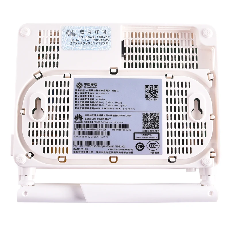 EchoLife HS8546V5 is an intelligent gateway device created by huawei for China mobile's gigabit fiber smart home solution . It provides a POTS voice interface, four GE/FE adaptive Ethernet ports and dual-frequency wi-fi (2 .4ghz & 5GHz) with flexible application and supports plug and play, remote diagnosis, green energy saving and other features .