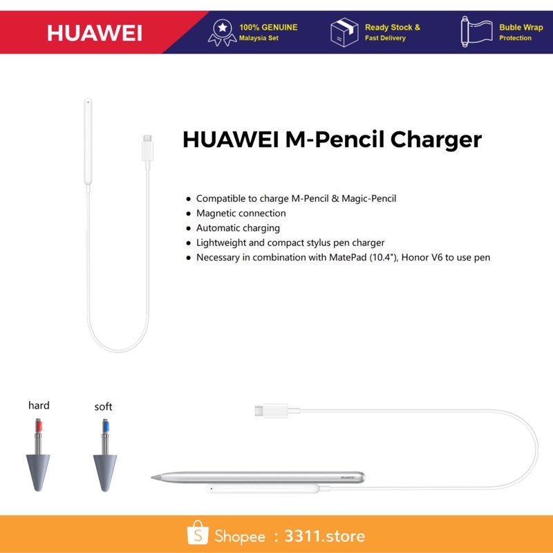 Huawei M-Pencil Charger . Compatible to charge M-Pencil & Magic- Pencil . Magnetic connection . Automatic charging . Lightweight and compact stylus pen charger . Necessary in combination with MatePad (10 .4"), Honor V6 to use pen . Original Huawei Accessory . Not available . $48 .48 .