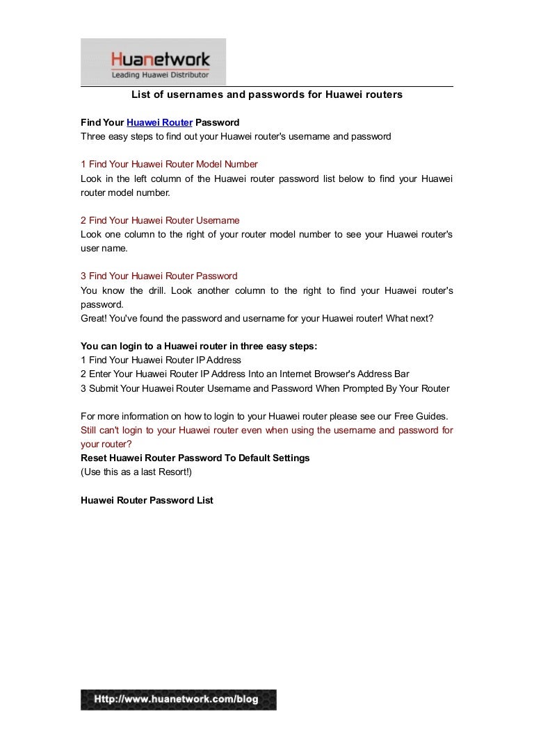 Enter Your Huawei Router IP Address Into your web browser's Address Bar; Enter your Huawei Router username and password when prompted; The list of user names and passwords is below . How to Reset Your Huawei Router Password To Default Settings . If none of the passwords below work for you then you have 2 options: Either try to recover your router's password with Network Utilities Find Password ; Or Reset your Huawei router ; Please only reset your router as a last resort . Huawei Router Password List