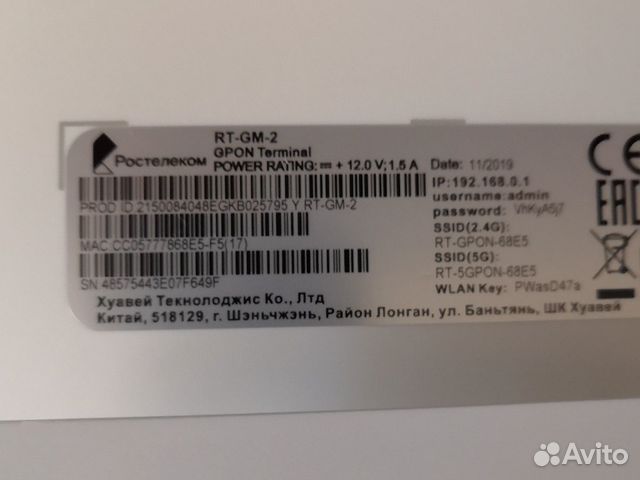 (PON) Huawei RT-GM-2 17/06/2020 . 111 . Основные характеристики: . . . На терминале RT-GM-2 услуга Интернет предоставляется по FTTH (FTTx) . . . Пароль - отображен на наклейке . . .