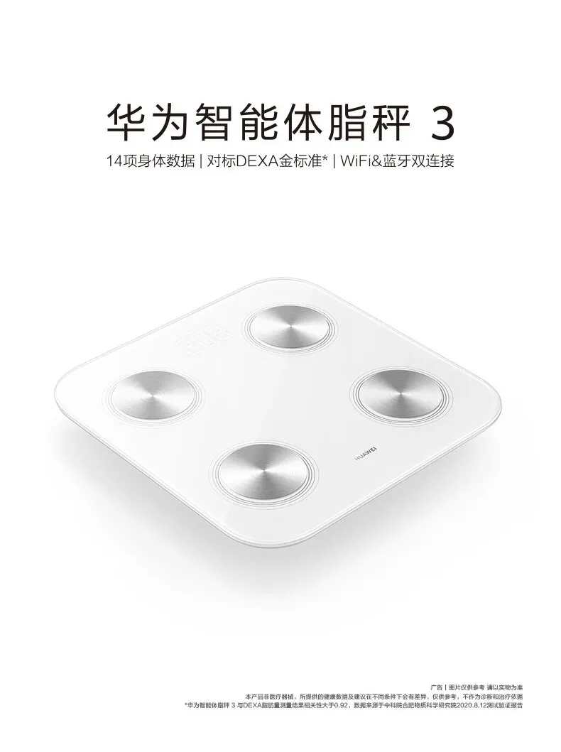 HUAWEI Scale 3 , 11 body indicators, skeletal muscle detection, body fat rate detection, body composition analysis report, WiFi & Bluetooth connections, guest mode, 3 .5 mm low scale feet, Huawei quality