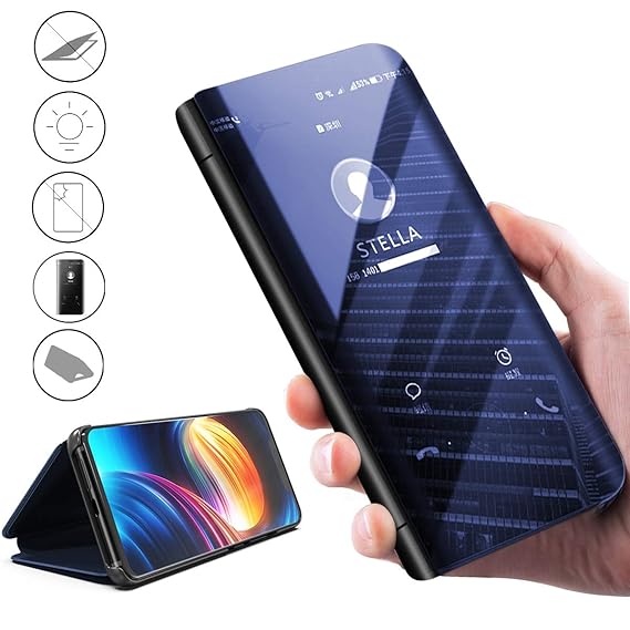 Descrizione prodotto . View Smart cover Huawei P30 Lite in colore blu con finestra intelligente . La custodia permette di visualizzare ora, meteo, conteggio passaggi, chiamate perse e nuovi messaggi, rispondere e riagganciare senza aprire il flip .