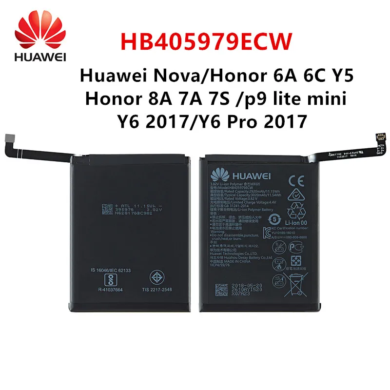 Аккумулятор для Huawei Honor 8A / 7A / Nova / Nova Lite 2017 / Honor 6A / Honor 6C / y5 2017 / y5 2018 HB405979ECW Литий-Ионная батарея HB405979ECW Ёмкость 3020 мАч / 3,82В Устанавливается на Huawei Nova; H . .